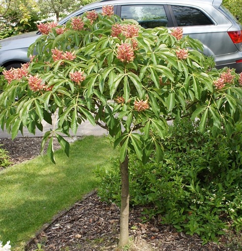 Саженцы Каштана конского Павия Дисколор (pavia var. discolor) – карликовое дерево, высота которого не превышает 200 сантиметров, с округлой густой кроной и гладким темно-серым стволом. Листья сине-зеленого оттенка по пять штук собраны в свисающие зонтики. Цветы имеют абрикосово-оранжевую расцветку и собраны в конусовидные соцветия. Каштан конского Павия Дисколор предпочитают хорошую освещенность, а также почвы, умеренно насыщенные влагой. Глинистую почву стоит сдобрить небольшим количеством песка или известняком, а также дополнить перегноем, это благоприятно скажется на развитии каштана.