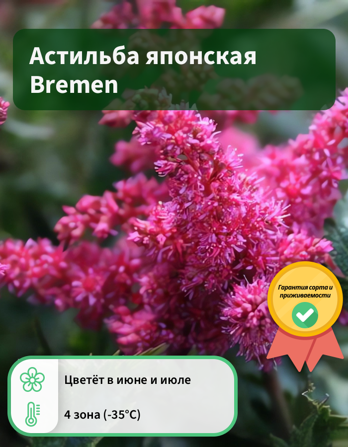 Рассада астильбы японской Bremen используется для озеленения загородных участков, оформления берегов водоемов и украшения зон отдыха. Взрослое растение представляет собой раскидистый куст высотой до 45 сантиметров. Летом на фоне яркой зелени листьев появляются темно-розовые пышные соцветия, которые прекрасно смотрятся в срезке. Рассада астильбы японской Bremen предпочитает слегка затененные места, а почва должна быть влажной, рыхлой и питательной. Это неприхотливое растение обладает зимостойкостью и не требует сложного ухода, что порадует опытных и начинающих садоводов.