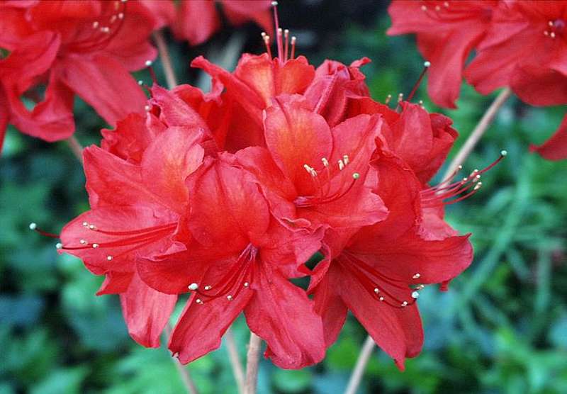 Азалия гибридная набукко - это великолепное растение с ярко-красными цветками, которое поразит вас своей красотой и изысканностью. Ее ствол устойчивый, а размеры достигают до 200 см в высоту и 120 см в диаметре. Листья азалии имеют темно-зеленую окраску весной и летом, а осенью радуют желто-красным оттенком. Форма листьев оригинальная, что делает это растение по-настоящему уникальным.