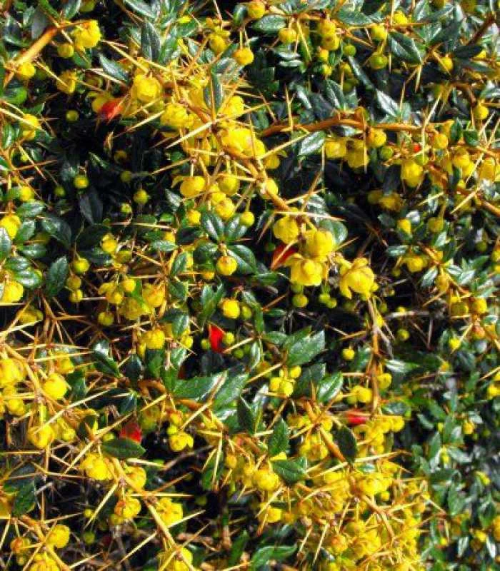 Саженцы барбариса бородавчатого (Berberis verruculosa) не спеша, выпростают в колючий, раскидистый кустик около 1-1,5 м в высоту. Стебли густо покрыты листвой и бородавками. Листики продолговатой формы, немного подогнутые в серединку, темно-зеленого тона. Цветет яркими, золотисто-желтыми цветочками в июне-июле. Цветение одиночное и обильное. Достоинства барбариса бородавчатого: - зимоустойчив - засухоустойчив - высокая декоративность Плоды барбариса бородавчатого имеют яйцевидную, продолговатую форму и насыщено-синий окрас. Ягоды собраны в небольшие, рыхлые кисти.