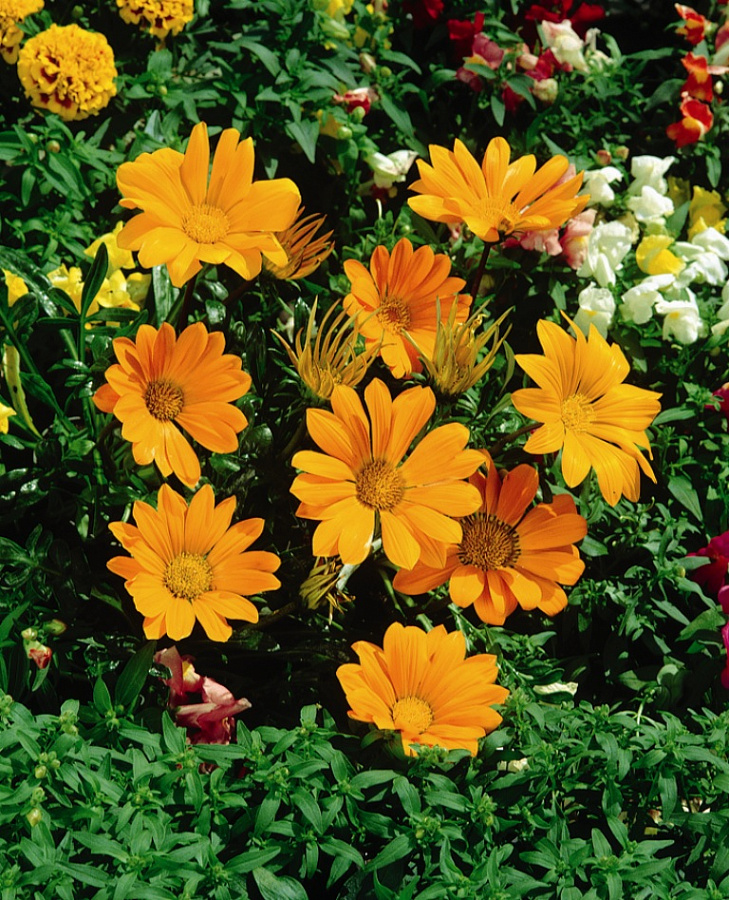 Семена газании Нью Дей F1 Клир Оранж прекрасно подходят для оформления садовых рабаток, создания ярких цветников и наполнения балконных контейнеров. Растение представляет собой миниатюрный куст высотой не более 30 см. На фоне плотной зеленой листвы с серебристым отблеском ярко выделяются оранжевые цветы диаметром около 12 см. Чтобы посадить семена газании Нью Дей F1 Клир Оранж, подготовьте почву: взрыхлите ее и удобрите комплексными подкормками. Уход за растением заключается в поливах, очистке места посадки от сорняков и регулярном рыхлении земли. Кусты цветут с середины лета до поздней осени.
