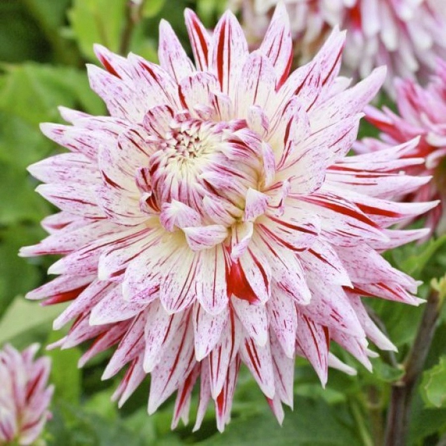 Луковицы георгины Avignon — это сорт, который хорошо смотрится в саду, в одиночных или групповых посадках. Такие растения прекрасно подходят для создания букетов. Кусты прямостоячие с прочными стеблями. Культура цветет продолжительно: с середины июля до первых заморозков. Высота кустарника составляет 90-120 см, а ширина варьируется от 45 см до 60 см. Соцветия-корзинки очень эффектно смотрятся на фоне насыщенно-зеленой листвы. Лепестки окрашены мазками белого, фиолетового, винного и лимонного цветов. Диаметр шапок достигает до 25 см.