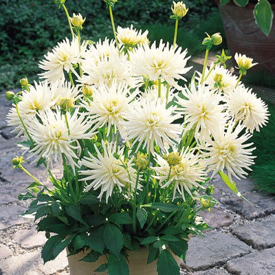 Луковицы георгины махровой Playa Blanca (Dáhlia variabilis) идеально подходят для формирования эффектных бордюров, украшения мест отдыха и создания красивых композиций. Высота взрослых кустов не превышает 45 сантиметров. Их плотные стебли не нуждаются в подвязке, а также не прогибаются под дождем. При благоприятных условиях цветение длится до октября. Посадив луковицы георгины Playa Blanca, вы украсите сад нежными белыми цветами с желтоватыми серединками. Растение предпочитает хорошо освещенные участки, но нуждается в защите от ветра. Кусты можно выращивать для срезки и последующего составления букетов.