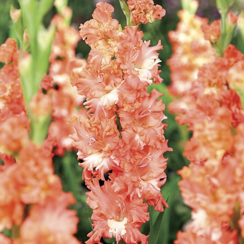 Луковицы гладиолуса гибридного Sunny Frizzles выращивают в открытом грунте на солнечных местах. К почве растение не требовательно. При общей высоте 130-150 см, длина колосовидного соцветия достигает 60-80 см. Бутоны плотно располагаются на цветоносе. Цветки крупные, сильно гофрированные. Основной цвет лепестков – лососевый, внутри бутончиков есть яркое молочно-белое пятно. Цветение продолжается с июля по сентябрь. Главное достоинство гладиолуса гибридного Sunny Frizzles – цветы не опадают даже от сильных дождей.