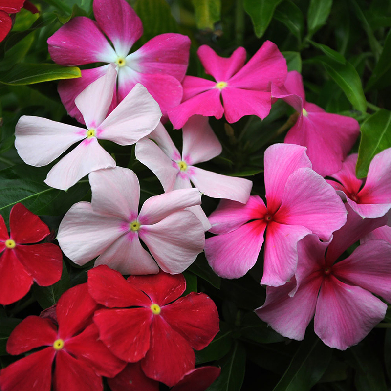 Семена катарантуса "Розовый, смесь окрасок" высевают в рассадные ящики в феврале. Первые всходы появляются при температуре +20 градусов через две недели. На постоянное место рассаду пересаживают в начале — середине мая. Участок выбирают солнечный или частично затененный с удобренной почвой. Высота взрослых растений достигает всего 30-35 см. Стебли тонкие, прямостоячие, густо покрыты овальными листочками насыщенно-зеленого оттенка, украшенными белой полосой. Цветочки появляются в июле. Они очень красивые, окрашены в белоснежный, розовый, сиреневый и малиновый цвет.