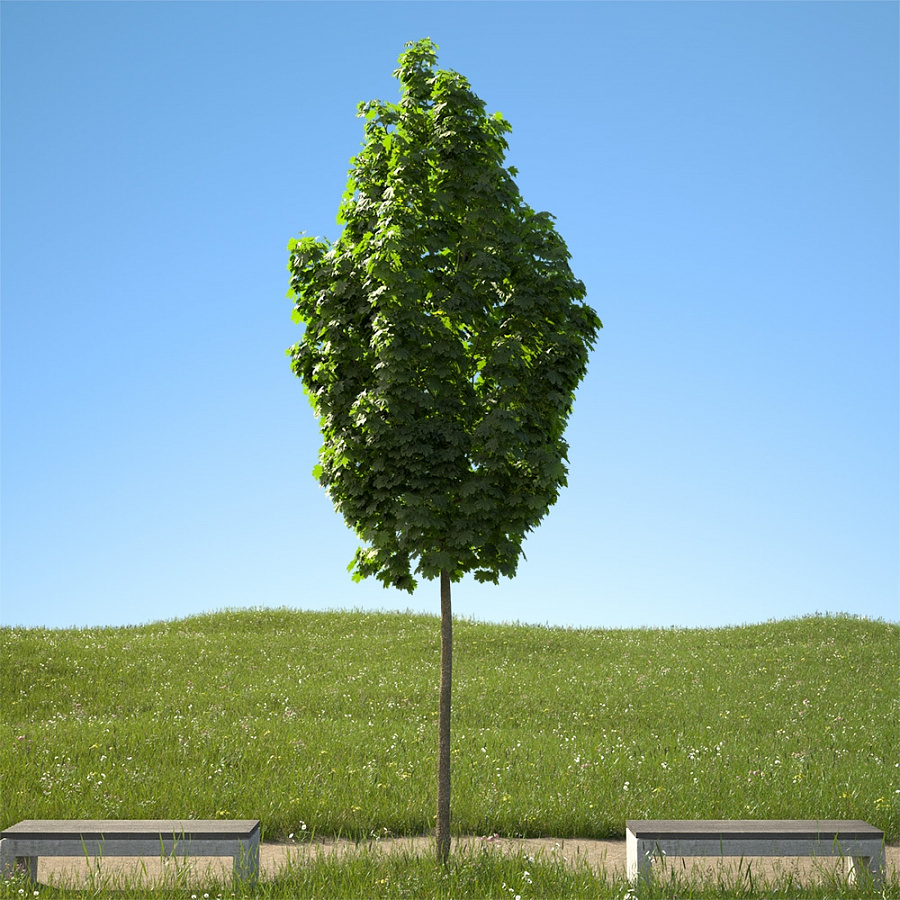 Саженцы Клёна остролистного Колумнаре (Columnare) – крупное дерево, высота которого достигает 16 метров, с раскидистой клиновидной кроной. Молодые листья красного оттенка, к лету становятся насыщенно-зеленого, а к осени обретают насыщенно-желтый оттенок с багряными разводами. Цветение происходит в апреле, мае: распускаются белые цветы, которые смотрятся невероятно декоративно. Плоды появляются к началу осени и представляют собой коричневую двукрылку.