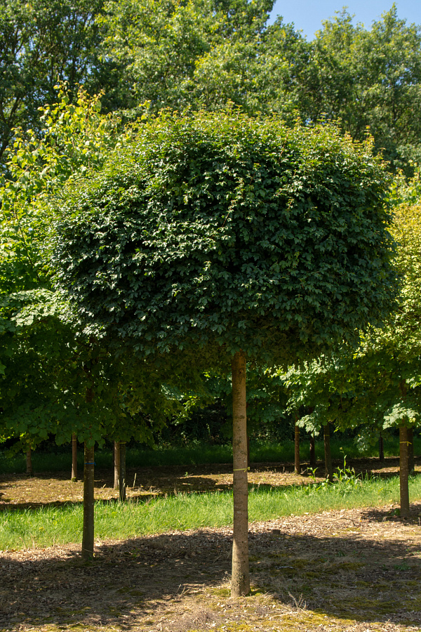 Саженцы клена полевого Нанум (Nanum) – сорт листопадных деревьев с изысканной естественной геометрией крон. На стройных прямых стволах молодых крупномеров эффектно покоятся круглые шапки из зеленой листвы. Взрослое растение вырастает в 2-3 м высоты. С возрастом крона становится более раскидистой и рыхлой. Цветет дерево мелкими желтыми соцветиями. Плодоносит клен полевой Нанум семенами-крылатками.