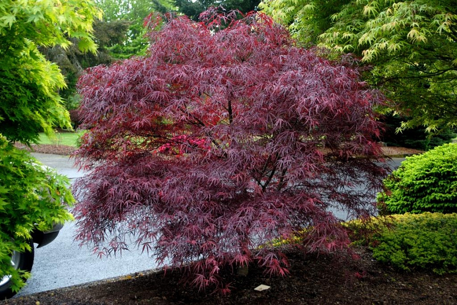 Саженцы Клёна веерного Тромпенбург (Trompenburg) – небольшое деревце или крупный куст, высота которого достигает 7 метров. Листья необычные: каждый рассечен на 7 или 9 лопастей, растопыренных по кругу, где каждая лопасть будто выгнута. Сначала, листья ярко-пурпурного цвета, летом они приобретают слегка зеленоватый оттенок, а к осени становятся насыщенно-багряными.