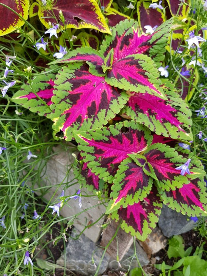 Семена колеуса Радуга высаживают сразу в открытый грунт. Однолетник вырастает до 40-50 сантиметров в высоту. Отличительной чертой гибрида является наличие пестрых, разноцветных листьев: желтые, красные, зеленые, черные. Солнцелюбивый колеус предпочитает произрастать на открытых и солнечных участках или подоконниках. Радуга отлично сочетается с другими растениями. Чаще всего используется в групповых посадках или высаживается в качестве фона с более низкими цветами. Для большей декоративности рекомендуется прищипывать молодое растение, чтобы оно красиво кустилось. С его помощью создают роскошные, цветные бордюры.