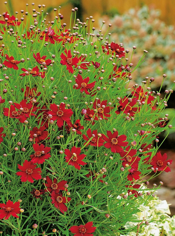 Саженцы Кореопсиса мутовчатого  Ruby Red (Coreopsis verticilata) декоративное многолетнее растение, которое достигает в высоту 50 см. Листья похожи на иголки и имеют яркий зеленый цвет. Куст покрывается при цветении многочисленными соцветиями красного цвета, которые похожи на маленькие звездочки. Данный сорт очень любит солнечный свет, а к почве неприхотлив, может расти на любой земле. Однако декоративные качества проявляют только на плодородных, хорошо удобренных почвах. Руби Ред цветет достаточно продолжительное время и весьма обильно – с июля по сентябрь. Цветы имеют яркий, насыщенный красный оттенок. Данный сорт кореопсиса можно использовать в посадке в чистых группах, рабатке или просто для среза.