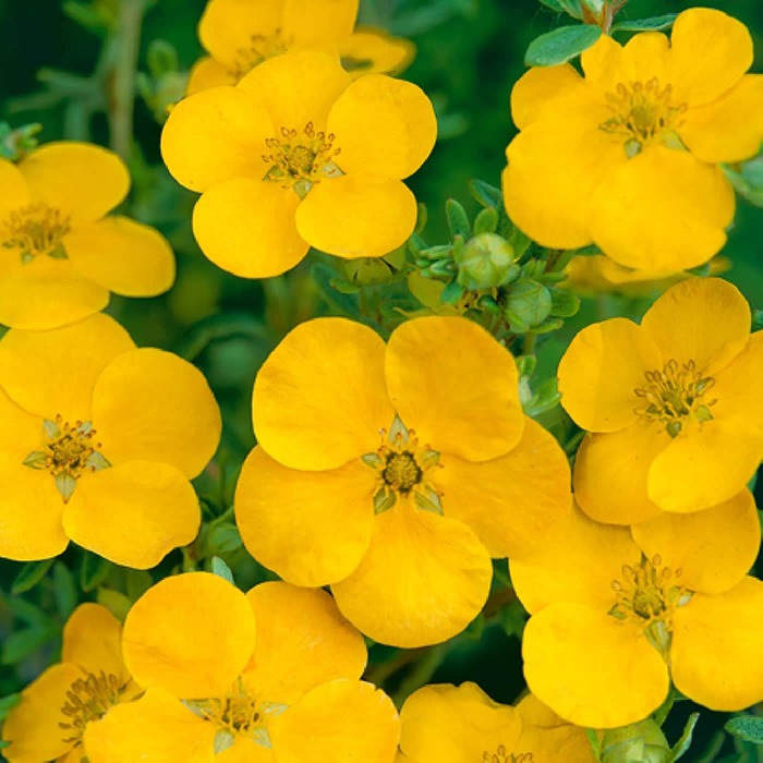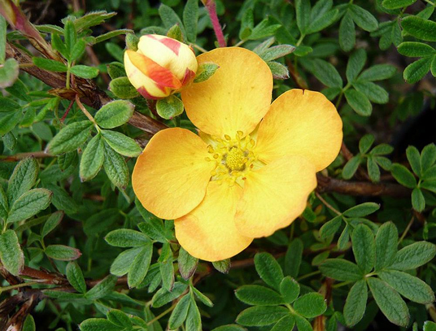 Саженцы лапчатки кустарниковой Танжерин (Tangerine) – достаточно компактный сорт. Максимальная высота этого растения – 60 сантиметров. Внешний облик крупномера радует взор – густая сочно-зеленая крона усыпана цветами, оттенки которых варьируются от золотисто-желтых до медно-оранжевых. Кустарник капризен: