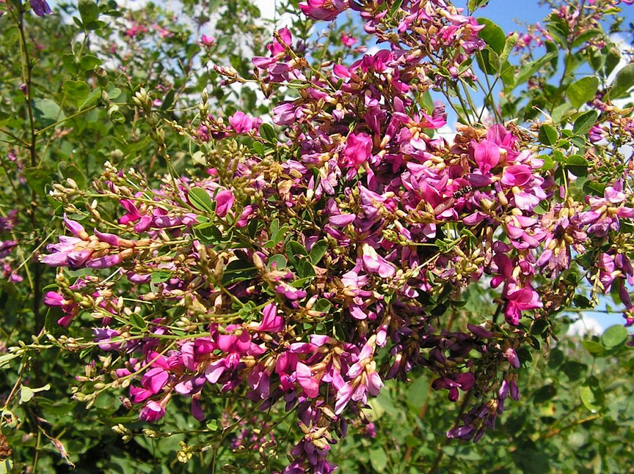 Саженцы Леспедецы двухцветной (Lespedeza bicolor) представлены в виде небольшого многолетнего листопадного кустарника, высота которого 300 сантиметров. Весной, на стеблях появляются маленькие, аккуратные листья, насыщенно-зеленого цвета, собранные на тонких черенках по три. В июне на кустарнике начинают краснеть соцветия ярко-малинового оттенка, которые объединены в колоски. Позже, цветы меняют свой окрас на блекло-сиреневый, что начинает придавать кустарнику, особой нежности. Леспедеца двухцветной предпочитает светлое место, а также умеренно-увлажненные супесчаные плодородные почвы. Она способна выдерживать морозы до –27 градусов, но без ветра, поэтому для оптимального развития подойдут умеренный и субтропический климат.