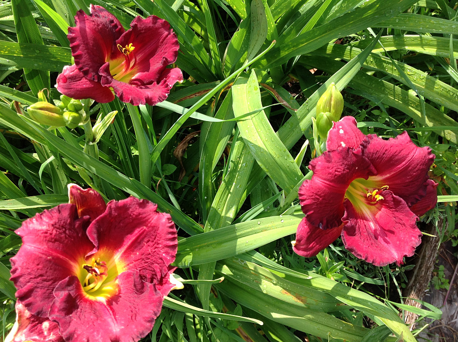 - небольшие требования в уходе. Цветки лилейника Джордан отличаются темно-бордовым оттенком слегка гофрированных по краю лепестков. Лимонно-желтое горло отделено от основного цвета красноватым глазком. После цветения можно собрать семена, которые хранятся довольно долго и могут проращиваться.