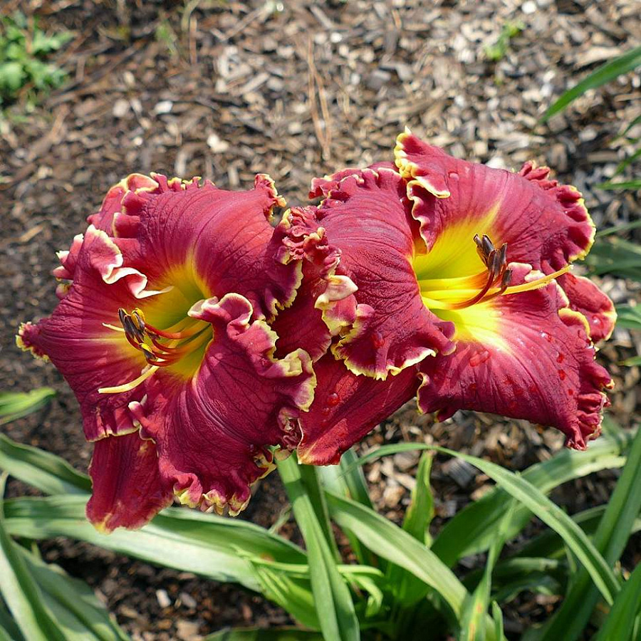Окраска цветка : Тёмно-вишневая с жёлтым глазком и белой каймой