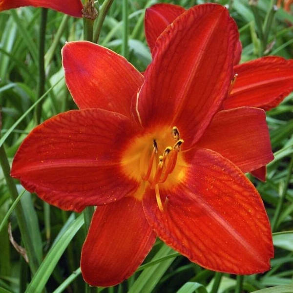 Лилейник гибридный "Кэмпфайр Эмберс" - это настоящий огненный шедевр среди садовых растений. Его ярко-красные цветы с желтым горлом напоминают пламя, разгорающееся на летнем закате. Высота этого лилейника достигает 65 см, что делает его идеальным выбором для групповых посадок в солнечных местах. Листья зеленой окраски создают прекрасный контраст с яркими цветами, придавая растению особый шарм.
