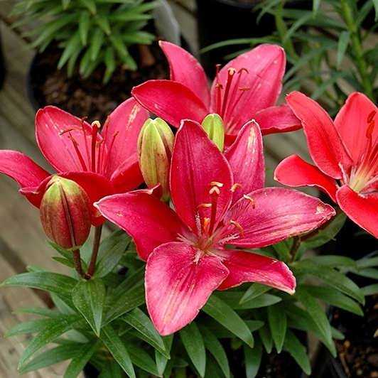 Цветки яркого розового цвета прекрасно смотрятся на фоне изумрудной зелени, в окружении светло-зеленых и темно-бордовых еще нераспустившихся бутонов. Лилия Баззер неприхотлива, быстро и легко размножается, цветет в конце июня – начале июля. Этот сорт подходит также и для выгонки.