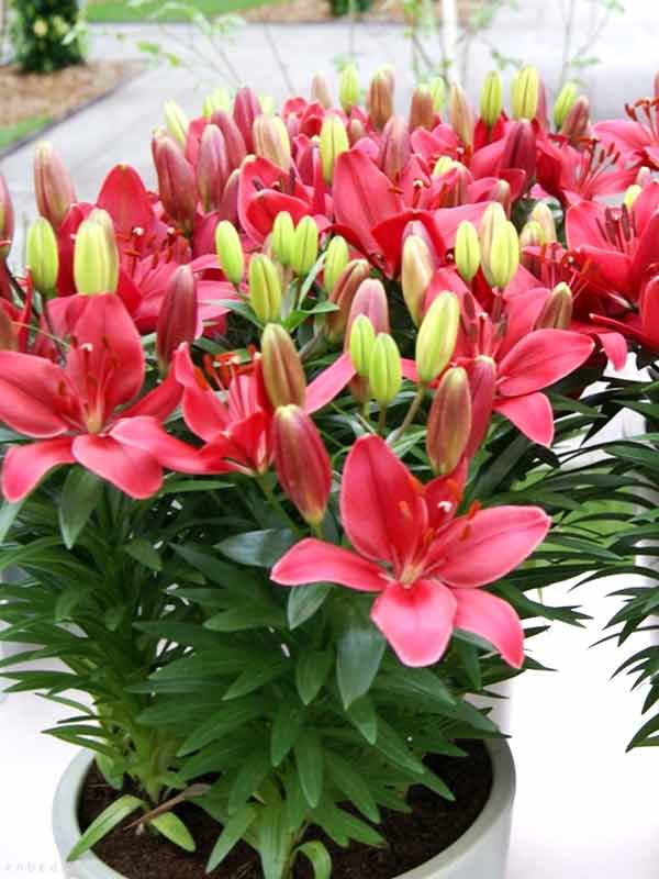 Саженцы и рассада лилии азиатской горшечной Баззе (Lilium asiatic Buzzer) представляют низкорослые сорта. Высота стеблей этой лилии достигает всего 45 см. Растение подходит для выращивания в открытом грунте, а также в горшках и контейнерах. Оно станет украшением балконов, веранд, террас или ландшафтных композиций.