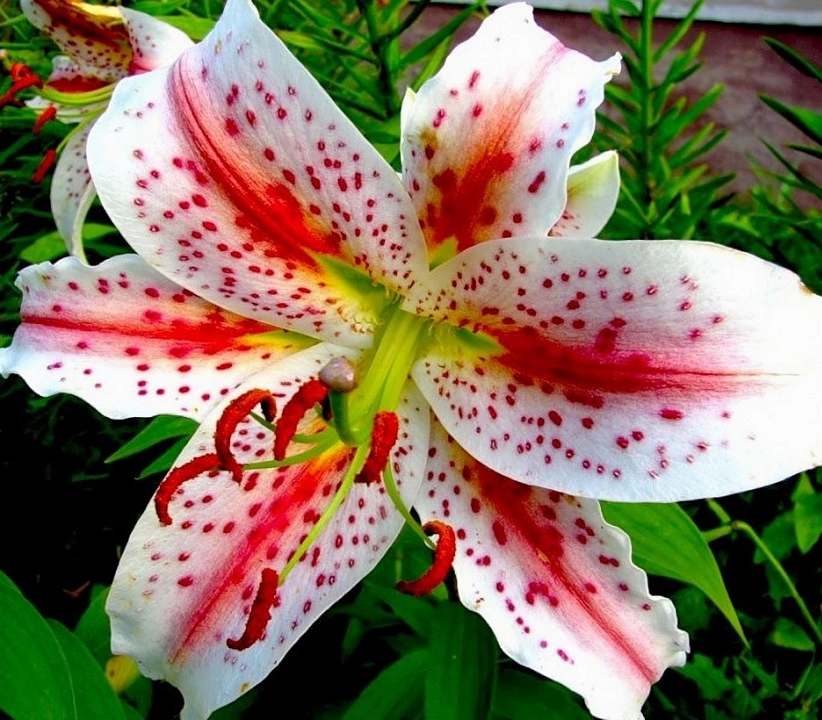 Луковицы лилии Excelsior предпочитают солнечные, теплые, слегка затененные места. Почва подходит любая хорошо дренированная. Стебли прямые, густо облиственные, зеленые, высотой 90-120 см. Растения отлично смотрятся в групповых посадках, миксбордерах, клумбах, подходят для выращивания на срезку. Цветки лилии Excelsior собраны по три-пять штук. Лепестки по краям немного волнистые, основная окраска белая, по центру идет красная широкая полоса. Дополнительно цветочки украшены крапинками.