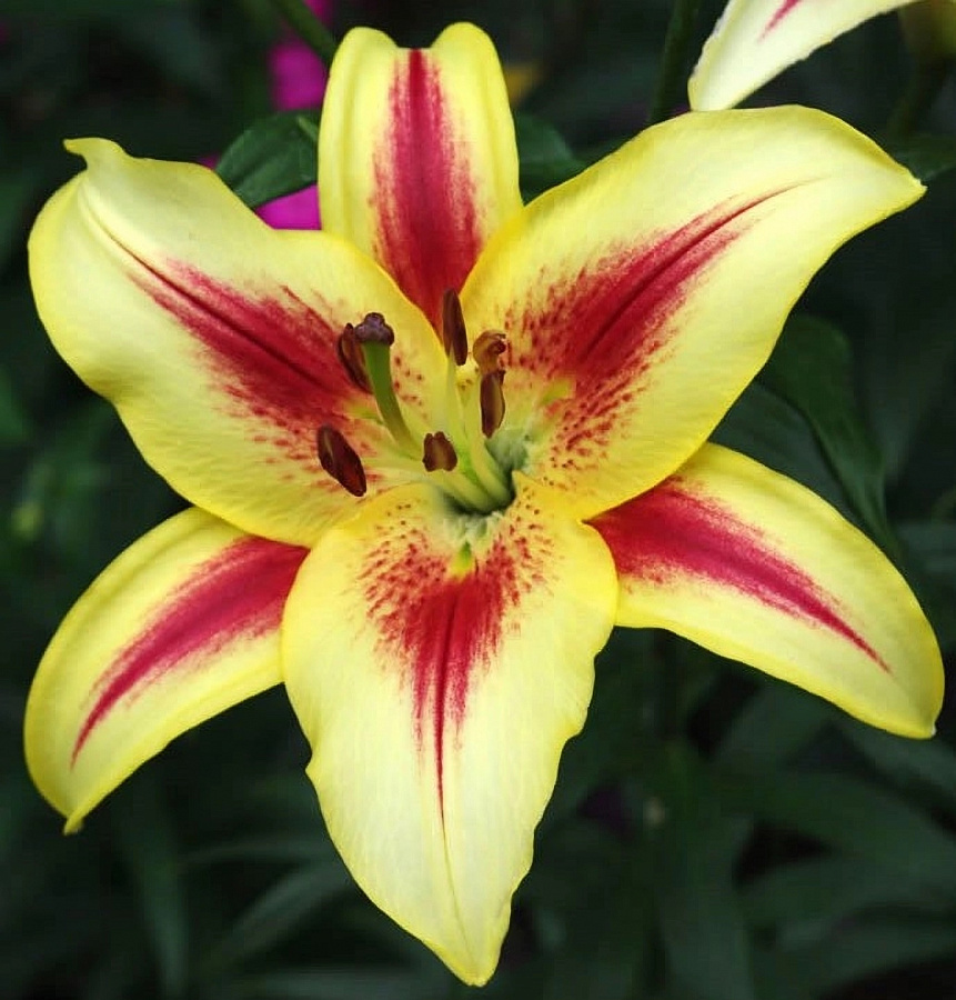 Луковицы лилии ОА-гибрид Санни Краун (Lilium OA-hybrid Sunny Crown) отлично приживаются на плодородных почвах с хорошим дренажем. Растение предпочитает укрытые от сквозняков и ветров места с любым уровнем освещенности. Органично смотрится в групповых посадках, смешанных цветниках, подходит для выращивания на срезку как в грунте, так и в теплицах, спокойно растет в горшках в домашних условиях. Высота многолетника 110 см, цветки до 25 см в диаметре. Головка составлена из двух трехлепестковых чаш с ярко-желтыми восковидными лепестками. В середине каждого – крупный сочный мазок малинового цвета.