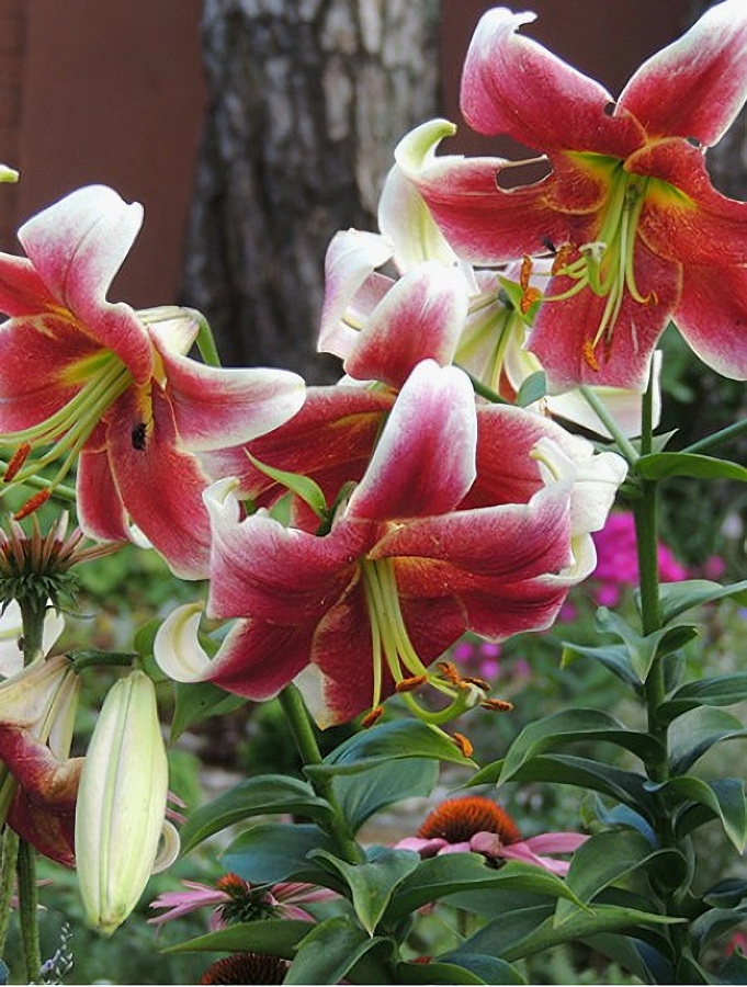 Окраска цветка : бордово-малиновый с белым кантом и кончиками лепестков, пыльники ярко-оранжевые