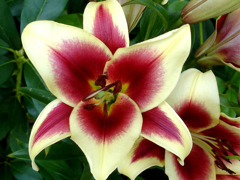 Окраска цветка : желтый с насыщенно-винным пятном до середины лепестков, и зеленцой у основания