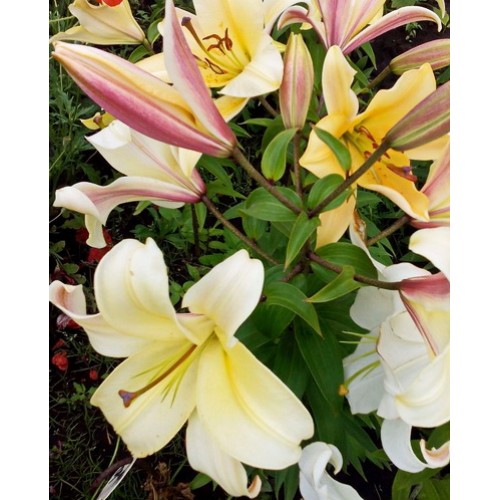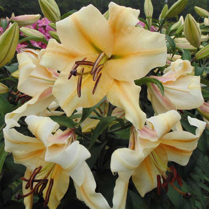 Лилия от-гибрид сантини - это великолепное растение, которое поразит вас своей красотой и изысканностью. Ее стебель прочный и прямой, достигает высоты до 120 см, а цветки кремового цвета с желтыми мазками и темными пыльниками радуют глаз весной и летом. Листья лилии имеют зеленую окраску и уникальную форму, что делает растение еще более привлекательным.