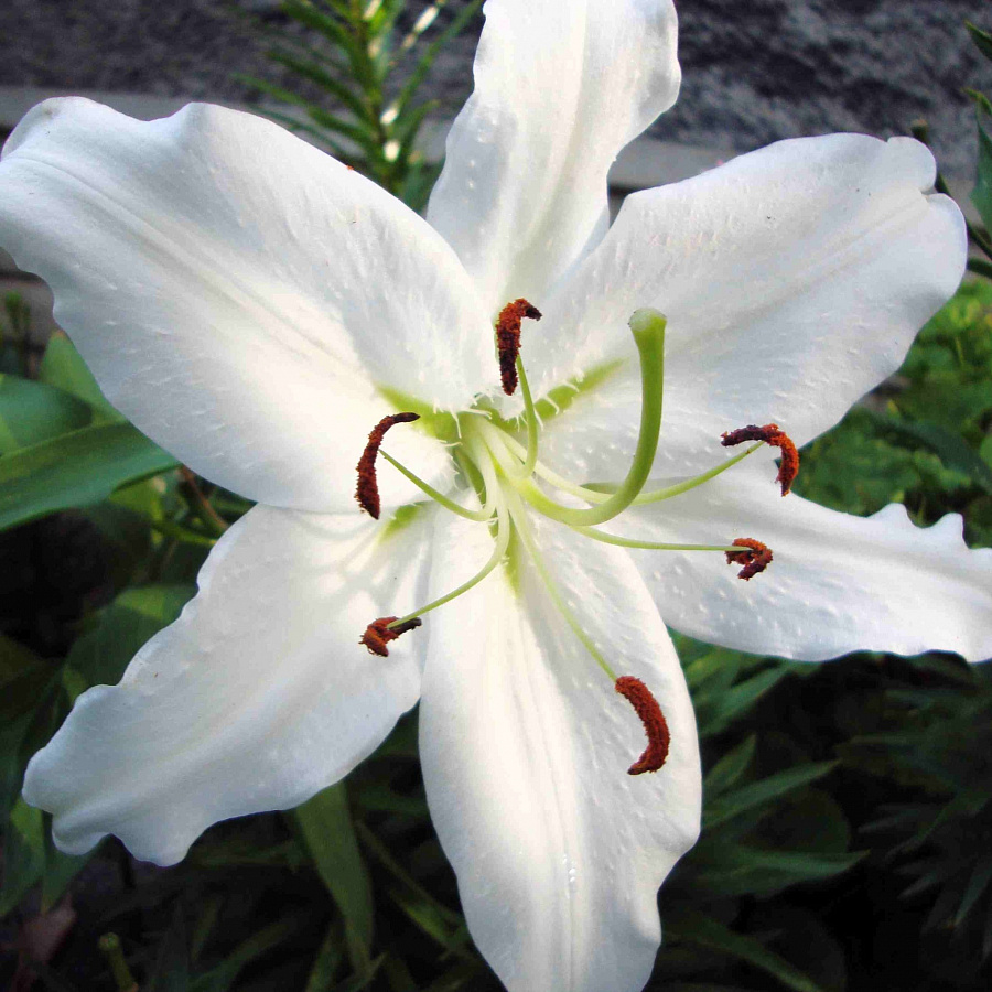 Окраска цветка : белоснежный с коричневыми пыльниками