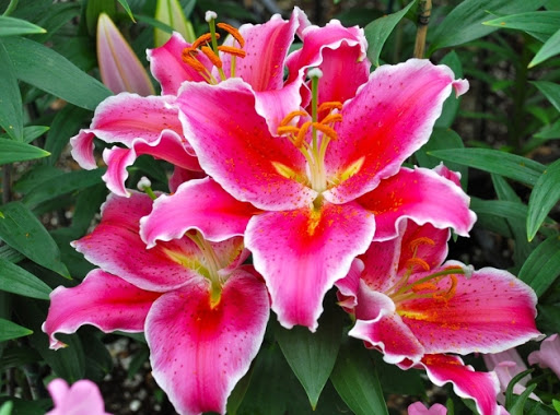 Саженцы и рассада лилии восточной Фурио (Lilium Oriental Hybrid Furio) станут настоящими жемчужинами вашего сада. На стеблях высотой 110 см распускаются крупные, диаметром до 20 см, малиново-красные цветки с приятным ароматом. По центру волнистых лепестков расположены темно-малиновые полосы и редкий крап, а их края эффектно очерчены белой контрастной каймой.