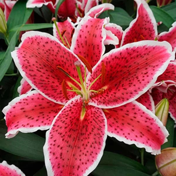 Луковицы лилии восточной Ред Айс относятся к гибридам восточного происхождения. Все цветки данной сортовой серии отличаются крупными цветками, неприхотливостью, морозостойкостью и устойчивостью к заболеваниям. Данный сорт характеризуется цветками с диаметром до 22 сантиметров, ярко-розовыми, почти малиновыми, с характерным крапом более темного оттенка и белой полоской по краю лепестков. Все лепестки слегка гофрированы, что придает этой лилии дополнительное очарование. Особенность сорта ― стойкий и насыщенный аромат. Цветение начинается в июле и продолжается примерно два месяца.