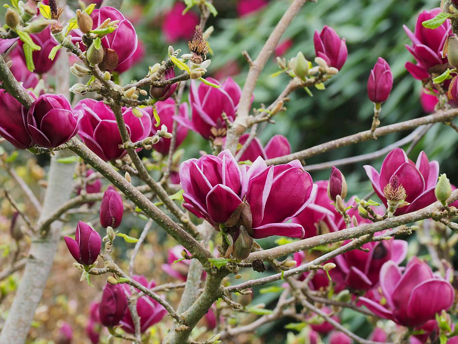 Саженцы магнолии гибридной Джени (Genie) вырастают в эффектные деревья, цветущие темно-рубиновыми цветками. Взрослый куст имеет коническую форму кроны и вырастает в 3-4 м высоты. Бутоны похожие на тюльпаны, распускаются в крупные круглые цветки диаметром почти 15 см. Растения очень ветвистые и больше похожи на кусты, с компактной кроной и плотным ветвлением. Зацветает магнолия гибридная Джени в конце апреля или в мае. Достоинства: