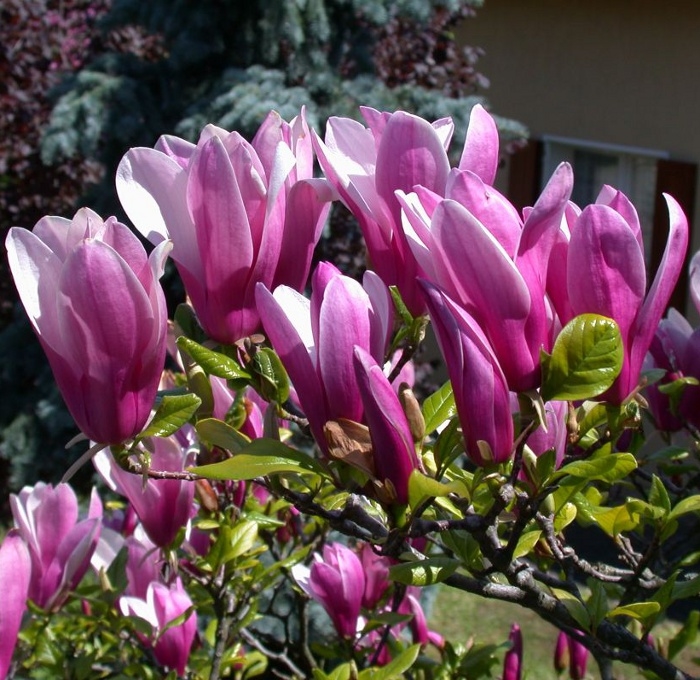 Саженцы магнолии гибридной вырастут в раскидистые листопадные растения с множеством изумительных крупных цветов. Взрослые растения принимают форму кустарника или дерева, высотой до 2-3 м. Крупномеры зацветают в середине весны, цветение обильное и длится достаточно долго. Цветы имеют форму чаш, с продолговатыми нежными лепестками, и распространяют приятный аромат. Листья овальные, вытянутые, темно-зеленого цвета. Крона молодой магнолии гибридной принимает форму конуса, затем разрастается в ширину. Достоинства: