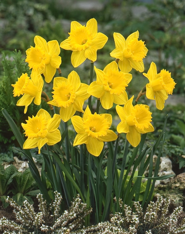 Луковицы нарцисса Карлик Датч Мастер (Narcissus, Dutch Master) подойдут ценителям небольших эффектных растений. Максимальная высота взрослого нарцисса 20-25 сантиметров, диаметр цветка 7-8 сантиметров. Впечатляет колоритный окрас — насыщенно желтые лепестки и крупная корона такого же оттенка контрастируют с зеленой листвой и мясистыми стеблями. Декоративная культура распускается в начале весны, цветет в среднем 2-3 недели. Сорт высаживают на газонах, палисадниках, рабатках, включают в групповые насаждения. Оригинально смотрятся клумбы-солитеры из нарциссов.