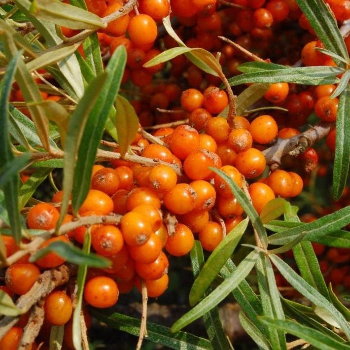 Саженцы облепихи Hippophae rhamnoides развиваются в многоствольные кустарники, имеющие не только декоративные свойства, но и очень полезные вкусовые. Они ценны и своими целебными свойствами. Растения 1-3 метров высотой покрыто длинными колючками. Листочки узкие светлые, почти серые. Цветет желтенькими цветами в конце весны. А осенью появляются и сами витаминизированные ягоды-костянки ярко–оранжевого цвета. Плоды облепихи Hippophae rhamnoides обладают свойствами: богаты витаминами, особенно С, заживляет раны, заживляет язву желудка. Крупномер растения облепихи - морозостойкий сорт.