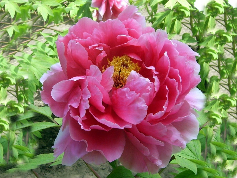 Саженцы пиона древовидного Восход (Paeonia Suffruticosa) идеально подходят для групповых посадок. Кустарник высокорослый, высотой до 1,2 метров. Пион выглядит декоративно даже после цветения из-за красивой пышной листвы. Расти предпочитает на хорошо дренированном грунте и солнечных участках. Цветки махровые, крупные, в диаметре от 20 до 25 сантиметров. На одном кусте может расцветать до 70 соцветий. Благодаря такому обильному цветению кустарник выглядит очень эффектно. Лепестки малинового оттенка. Продолжительность цветения короткая – 12-14 суток. При правильно уходе на одном месте пион может расти до 20 лет.