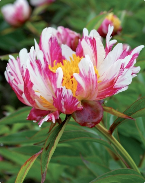 Саженцы пионов Твиттерпэйтед (Twitterpated) неприхотливы в уходе и к условиям роста. Срок цветения ранний. Цветок диаметром 10-15 см, нежно-розовый или кремовый с вишневыми или малиново-красными нерегулярными полосами и штрихами. В центре золотисто-желтые тычинки. Цветок отличается нежной и необычной формой, за что его так любят садоводы. Стебли с двумя бутонами. Высота многолетника 80-90 см. Сорт саженцев пионов Твиттерпэйтед морозостойкий и обладает иммунитетом против садовых вредителей и болезней.