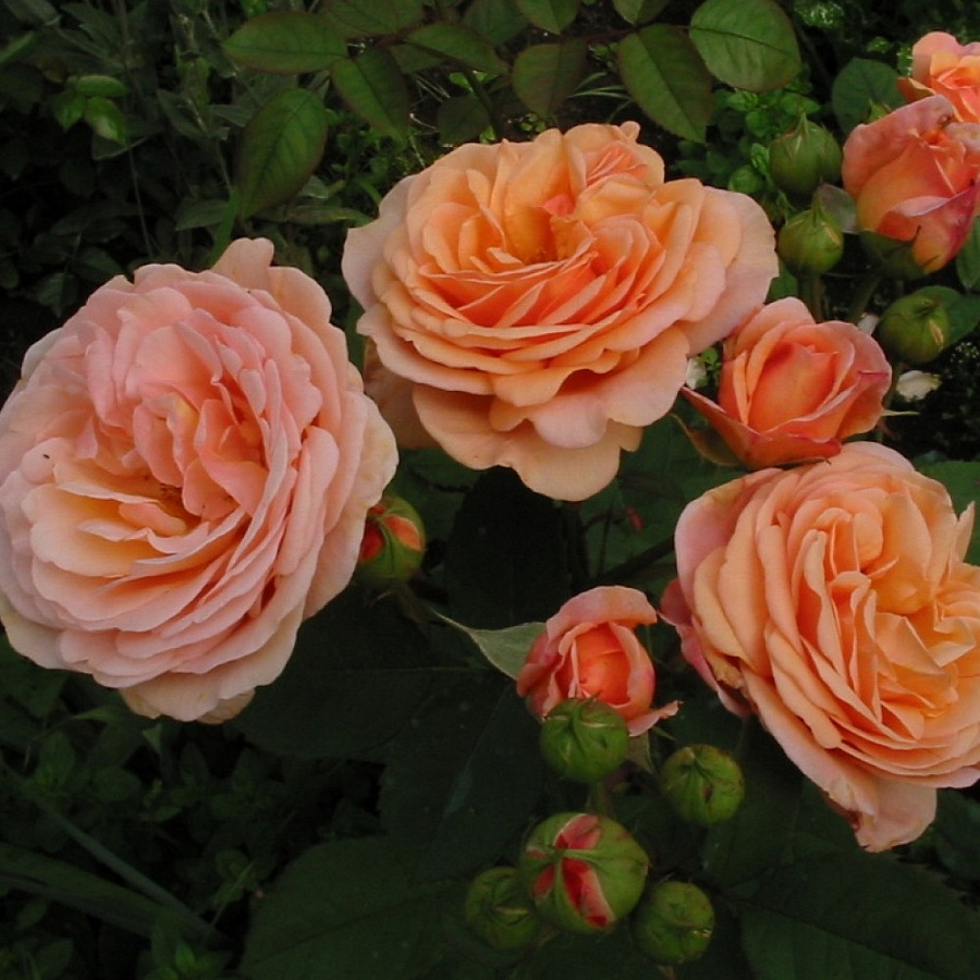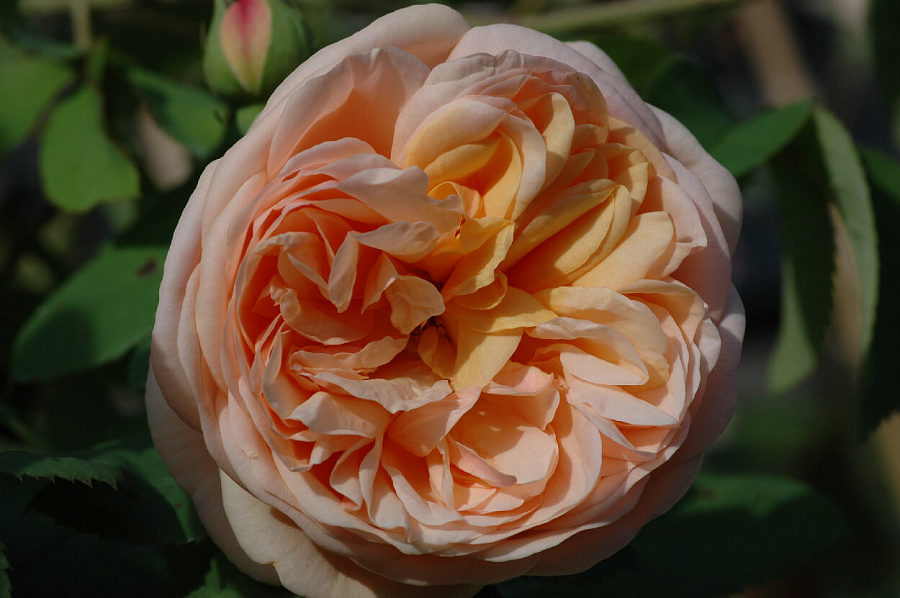 Цветы: крупные, нежного розового цвета с абрикосовым отливом. Множество лепестков собраны в чашевидные махровые соцветия.