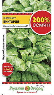 Семена шпината "Виктория" высевают ранней весной, летом или под зиму. Перед этим их желательно замочить в течение суток, меняя 2-3 раза воду. Сорт семян шпината "Виктория" позднеспелый. Период от полных всходов до хозяйственной годности составляет 19-37 дней. Розетка компактная, прижатая, в диаметре 14-19см. Листья темно-зеленого цвета с голубоватым оттенком, длиной до 10 см, шириной до 7 см. Черешок листа толстый. Урожайность с 1 кв. м составляет 2,6-3,5 кг. Растение широко используется в свежем виде, для приготовления соусов, салатов и в переработке.