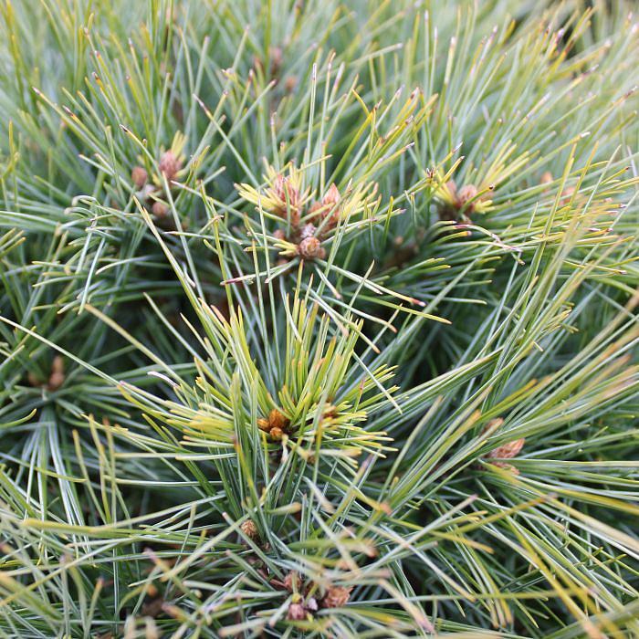 Саженцы сосны Веймутова Минима (Minima) – карликовые шаровидные кустарники с голубовато-зеленой кроной, усыпанной золотыми свечами растущих побегов. Средняя высота взрослого крупномера не больше 1м, диаметр до 1,7 м. Ветвистые побеги начинают рост от земли, что придает сосне Веймутова Минима пушистую округлость. Хвоя средней длины, по мере роста, меняет оттенок от желто-лимонного до голубого, поэтому кустарник смотрится живо и контрастно. Достоинства: