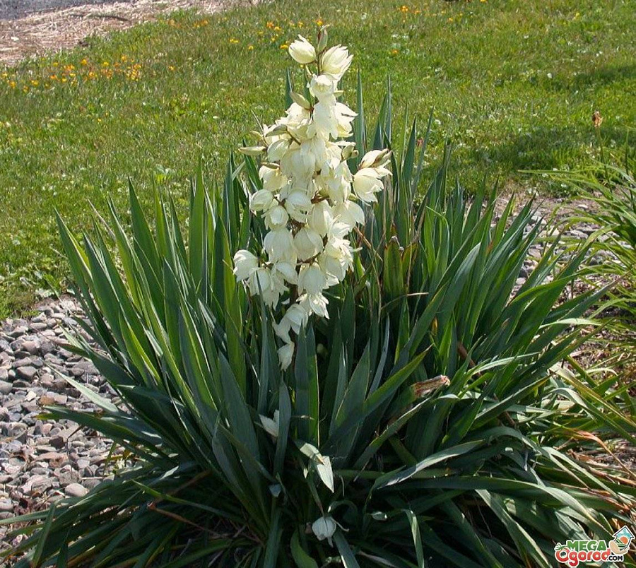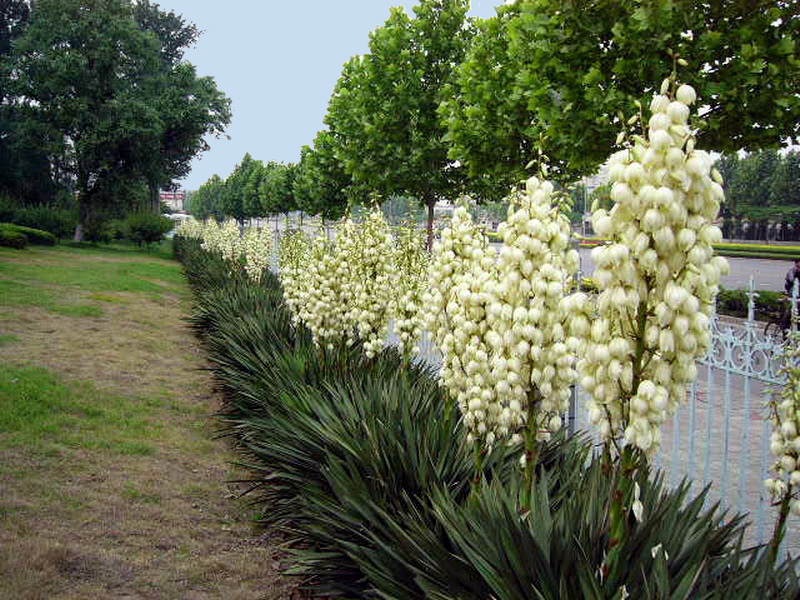 Саженцы юкки нитчатой – вне конкуренции, так как это бесстебельное растение, имеет сизо-зеленые листья,длинной 70 см и желтоватые цветы,размер которых 8 см,собранные в пышное соцветие, достигающее двухметровой высоты. Особенности растения, которые важно знать при покупке саженцев и крупномеров: высокие показатели морозостойкости; важен хороший дренаж, отсутствие переувлажнения; желательна легкая почва, подкормка органическими и минеральными удобрениями. Юкку размножают корневыми отпрысками, так как семена не всходят без опыления искусственным путем.